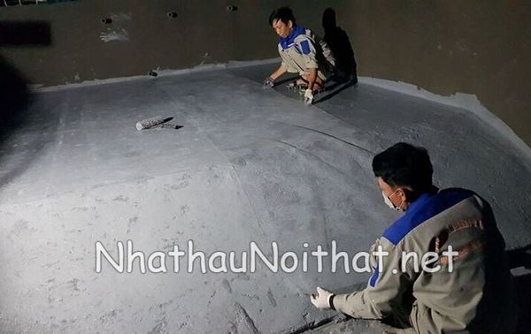 • Gia cố khu vực thoát nước: Thợ thi công tiến hành đục một rãnh nhỏ hình chữ V bao quanh phễu thu nước sàn. Chúng tôi đổ vật liệu vữa không co ngót kết hợp với hợp chất trám khe gốc nhựa dẻo (Polyurethane) vào rãnh này. Thao tác này ôm sát vách ống nhựa, chặn đứng hoàn toàn con đường nước ngầm đi xuống trần nhà bên dưới.