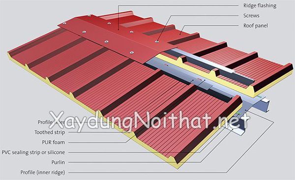 • Cấu tạo: Gồm lớp tôn bề mặt, lớp PU cách nhiệt mật độ cao ở giữa và lớp giấy bạc hoặc tôn đáy chống nóng.